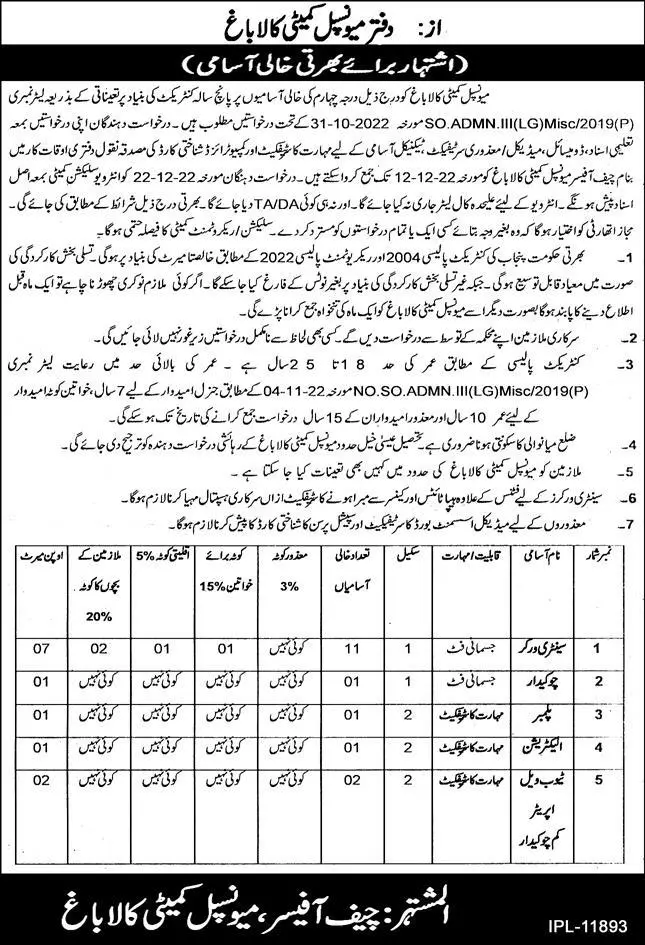 - Municipal Committee MC Kalabagh, Local Government & Community Development Department Kalabagh, mianwali Punjab Pakistan invites applications from eligible candidates for the post of plumber, chowkidar, electrician, sanitary worker and tube well operator as per advertisement of November 17, 2022 published in daily Express Newspaper.