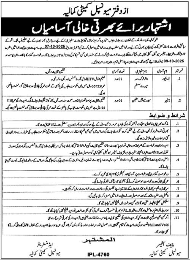 Municipal Committee Kamalia Jobs 2025 announce the Contract career opportunities for the post of See Below Ad in Sindh, Karachi for the fresh and experienced candidates on Contract basis who have Check Advertisement degree. Posted date of this post is 24/09/2025 and the last date is 07/10/2025. if you are eligible for this job apply before due date.