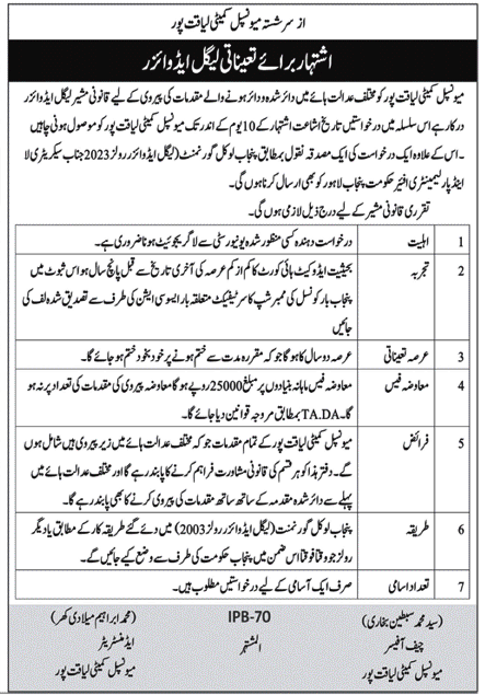 Municipal Committee Liaqatpur requires a legal advisor to pursue cases filed and to be filed in various courts. Applications in this regard should be received by the Municipal Committee Liaqatpur within 10 days from the date of publication of this advertisement. In addition to this, one attested copy of the application according to the Punjab Local Government (Legal Advisor) Rules 2023 must also be sent to the Honorable Secretary Law and Parliamentary Affairs, Government of Punjab, Lahore. The following will be mandatory for the appointment of a legal advisor:
