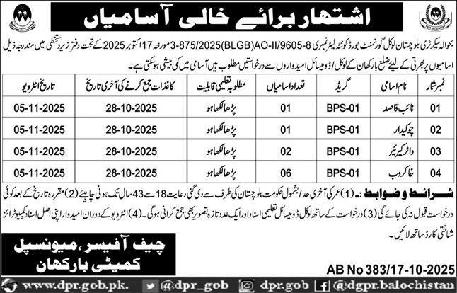 Reference: Secretary Balochistan Local Government Board Quetta, Letter No. 3-875/2025(BLGB)AO-II/9605-8, dated 17 October 2025. Applications are required from local/domiciled candidates of District Barkhan for the following posts in this office. The number of posts may be increased or decreased.