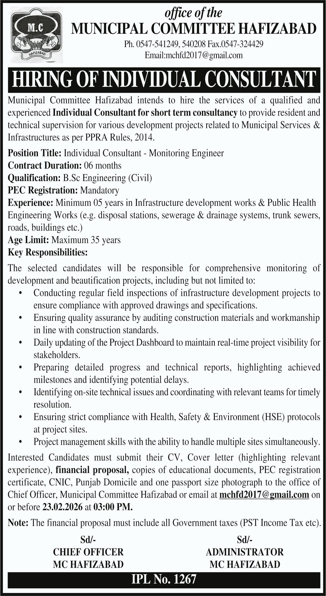 Interested Candidates must submit their CV, Cover letter (highlighting relevant experience), financial proposal, copies of educational documents, PEC registration certificate, CNIC, Punjab Domicile and one passport size photograph to the office of Chief Officer, Municipal Committee Hafizabad or email at mchfd2017@gmail.com on or before 23.02.2026 at 03:00 PM.