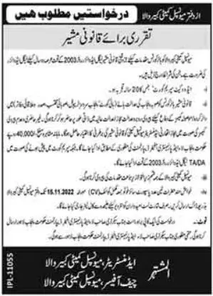 - Municipal Committee jobs advertisement dated about 2 November 2022 in daily Express Newspaper invites application for the vacant post of legal advisor in Kabirwala, kabirwala Punjab Pakistan. Candidates with LLb and BA etc. educational background will be preferred.