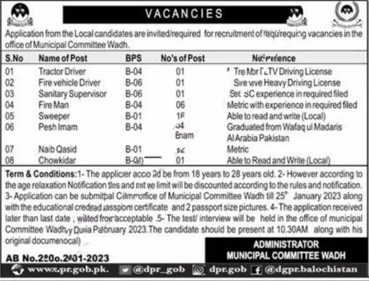 Municipal Committee MC Wadh Jobs 2023 announce the Contract career opportunities for the post of See Below Ad in Balochistan, Wadh for the fresh and experienced candidates on Contract basis who have Check Advertisement degree. Posted date of this post is 10/01/2023 and the last date is 01/02/2023. if you are eligible for this job apply before due date.