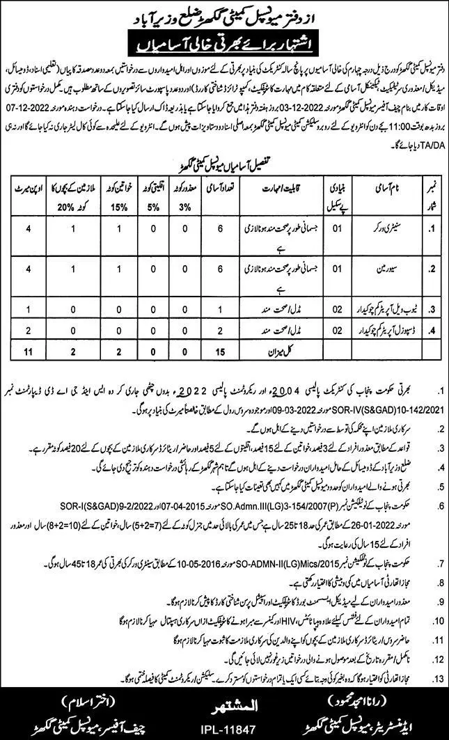 - Vacant posts including sanitary worker, sewer man, disposal operator cum chowkidar, driver and tubewell operator cum chowkidar are announced in Municipal Committee Wazirabad, wazirabad Punjab Pakistan as per 17 November 2022 advertisement in daily Dunya Newspaper.