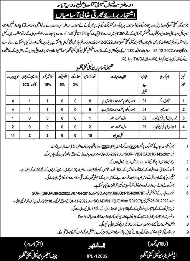 Municipal Committee Wazirabad Jobs 2022 announce the Contract career opportunities for the post of See Below Ad in Punjab for the fresh and experienced candidates on Contract basis who have Check Advertisement degree. Posted date of this post is 10/12/2022 and the last date is 28/12/2022. if you are eligible for this job apply before due date.