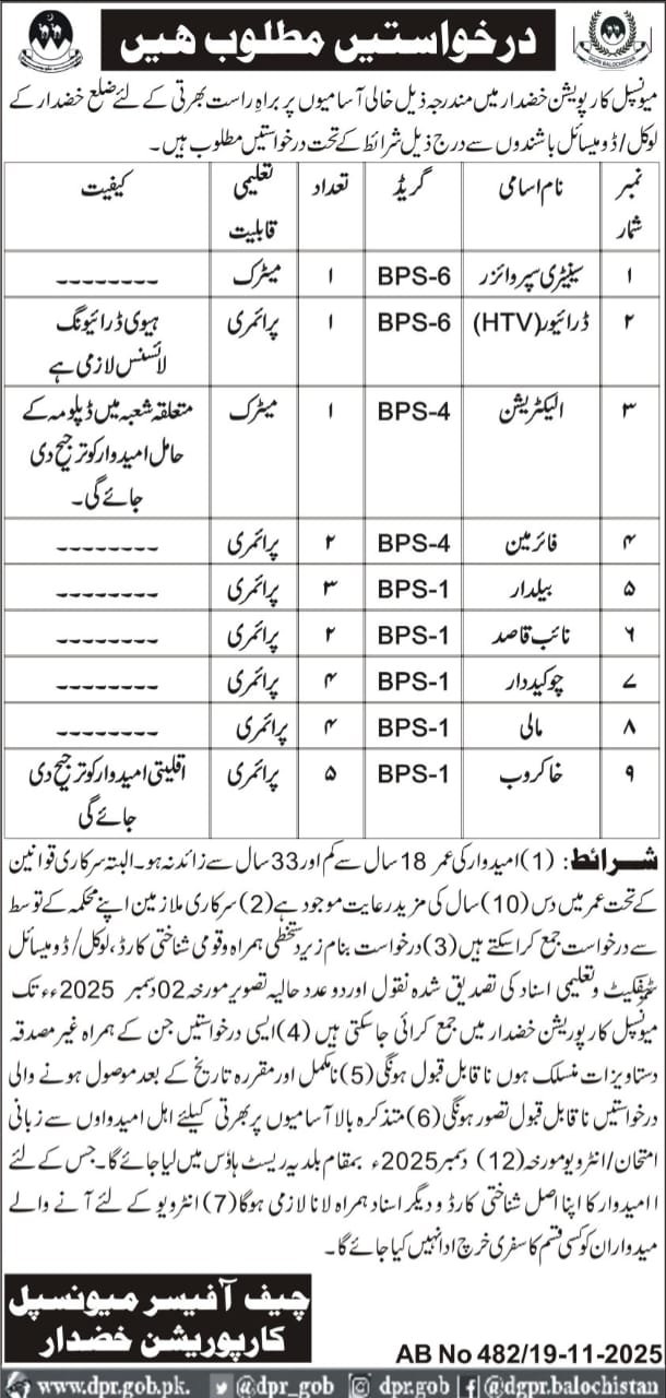 Municipal Corporation MC Khuzdar Jobs 2025 announce the Contract career opportunities for the post of See Below Ad in Balochistan, Khuzdar for the fresh and experienced candidates on Contract basis who have Check Advertisement degree. Posted date of this post is 20/11/2025 and the last date is 02/12/2025. if you are eligible for this job apply before due date.