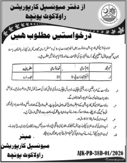 Municipal Corporation MC Rawalakot Poonch Jobs 2026 announce the Contract career opportunities for the post of See Below Ad in Azad Jammu Kashmir, Poonch for the fresh and experienced candidates on Contract basis who have Check Advertisement degree. Posted date of this post is 15/01/2026 and the last date is 29/01/2026. if you are eligible for this job apply before due date.