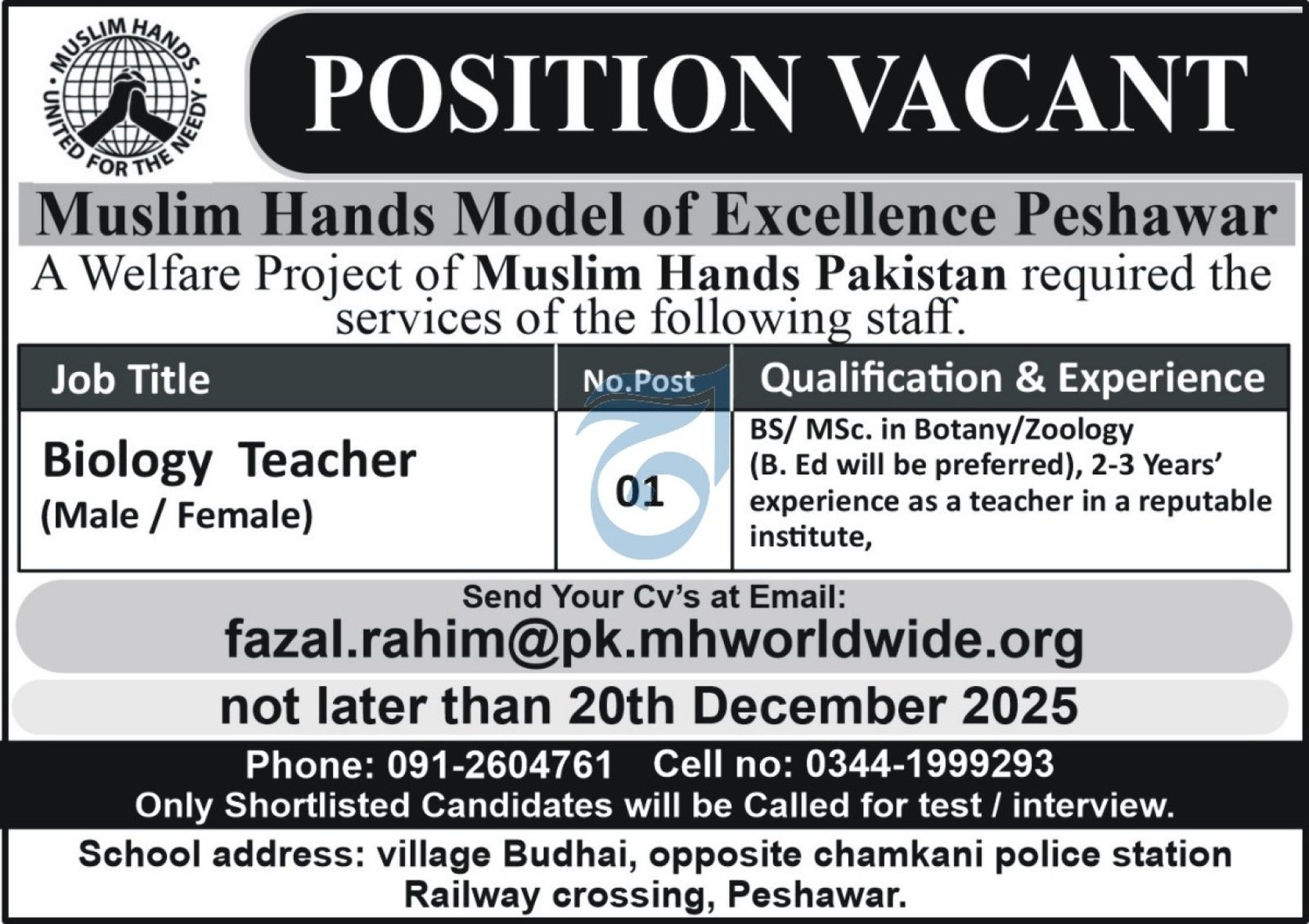 Muslim Hands Model of Excellence Peshawar Jobs 2025 announce the Contract career opportunities for the post of See Below Ad in Khyber Pakhtunkhwa, Peshawar for the fresh and experienced candidates on Contract basis who have Check Advertisement degree. Posted date of this post is 12/12/2025 and the last date is 20/12/2025. if you are eligible for this job apply before due date.