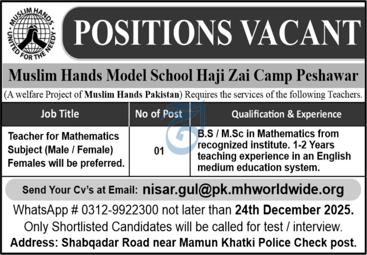 Muslim Hands Model School Haji Zai Cam Peshawar Jobs 2025 announce the Contract career opportunities for the post of See Below Ad in Khyber Pakhtunkhwa, Peshawar for the fresh and experienced candidates on Contract basis who have Check Advertisement degree. Posted date of this post is 18/12/2025 and the last date is 24/12/2025. if you are eligible for this job apply before due date.