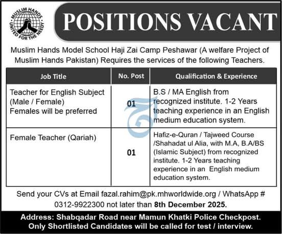 Muslim Hands Peshawar khyber Pakhtunkhwa Jobs 2025 announce the Contract career opportunities for the post of See Below Ad in Khyber Pakhtunkhwa, Peshawar for the fresh and experienced candidates on Contract basis who have Check Advertisement degree. Posted date of this post is 26/11/2025 and the last date is 08/12/2025. if you are eligible for this job apply before due date.