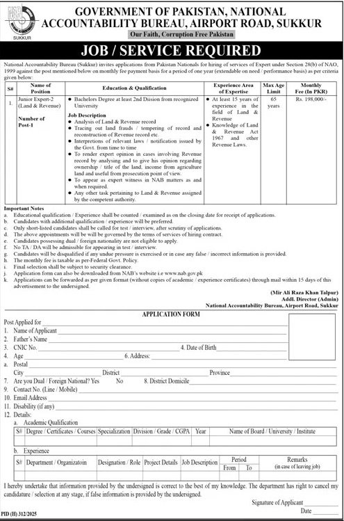 National Accountability Bureau (Sukkur) Jobs 2026 announce the Contract career opportunities for the post of See Below Ad in Sindh, Sukkur for the fresh and experienced candidates on Contract basis who have Check Advertisement degree. Posted date of this post is 13/02/2026 and the last date is 27/02/2026. if you are eligible for this job apply before due date.