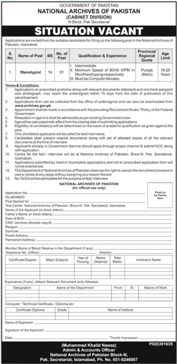 National Archives Of Pakistan Islamabad Job 2025 announce the Contract career opportunities for the post of See Below Ad in Federal, Islamabad for the fresh and experienced candidates on Contract basis who have Check Advertisement degree. Posted date of this post is 12/11/2025 and the last date is 27/11/2025. if you are eligible for this job apply before due date.