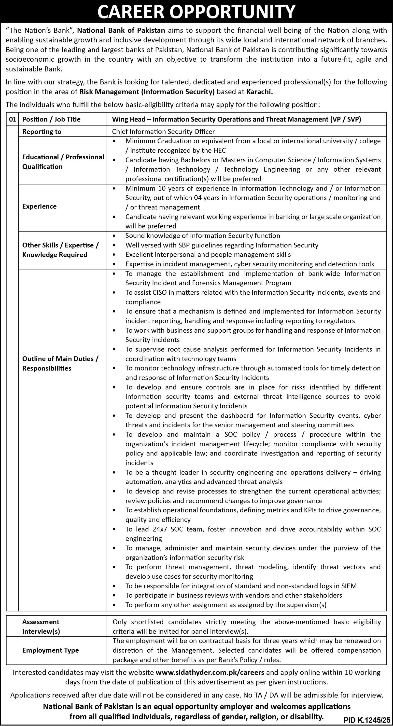 National Bank Of Pakistan NBP Karachi Jobs 2025 announce the Contract career opportunities for the post of See Below Ad in Sindh, Karachi for the fresh and experienced candidates on Contract basis who have Check Advertisement degree. Posted date of this post is 12/10/2025 and the last date is 24/10/2025. if you are eligible for this job apply before due date.