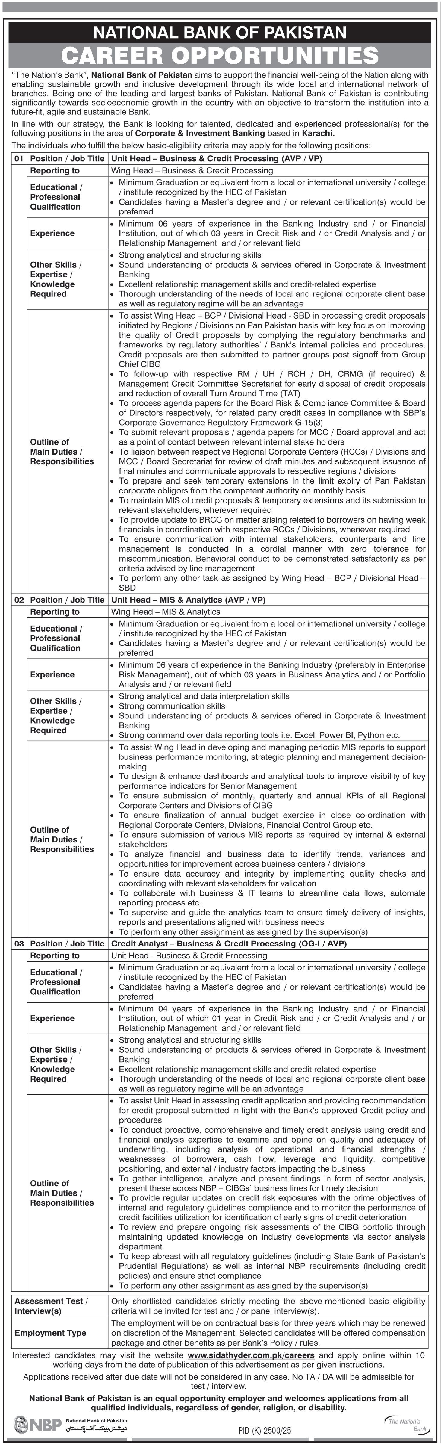 National Bank Of Pakistan NBP Karachi Jobs 2026 announce the Contract career opportunities for the post of See Below Ad in Sindh, Karachi for the fresh and experienced candidates on Contract basis who have Check Advertisement degree. Posted date of this post is 23/01/2026 and the last date is 02/02/2026. if you are eligible for this job apply before due date.