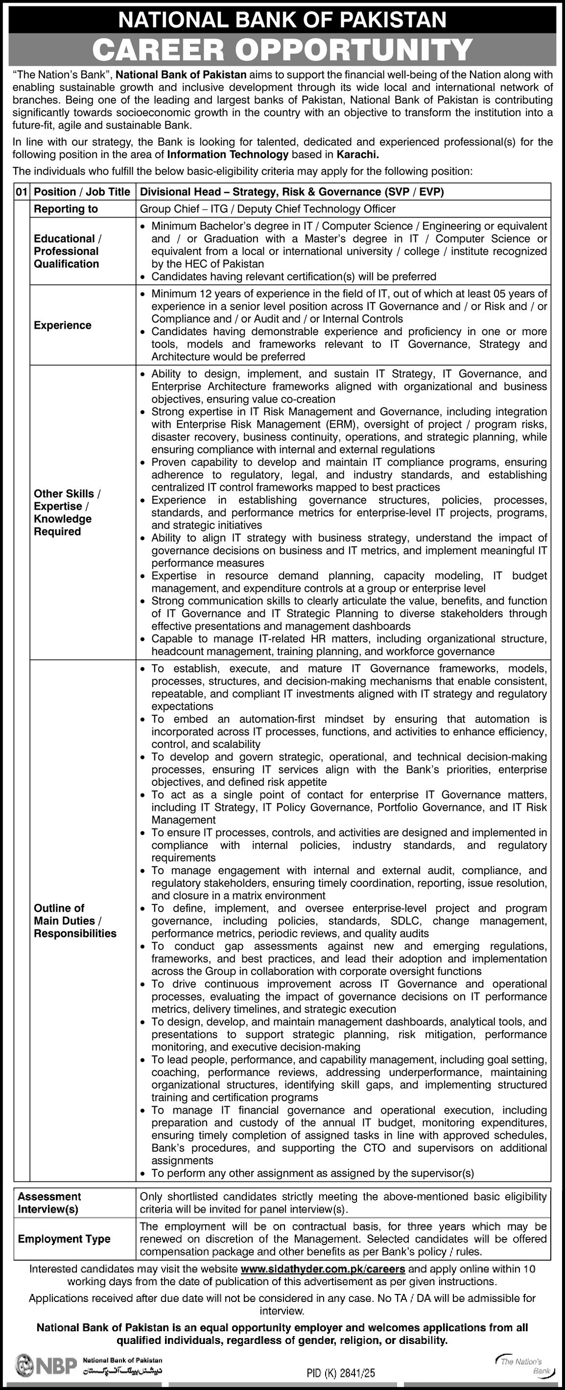 National Bank of Pakistan NBP Karachi Jobs 2026 announce the Contract career opportunities for the post of See Below Ad in Sindh, Karachi for the fresh and experienced candidates on Contract basis who have Check Advertisement degree. Posted date of this post is 22/02/2026 and the last date is 06/03/2026. if you are eligible for this job apply before due date.