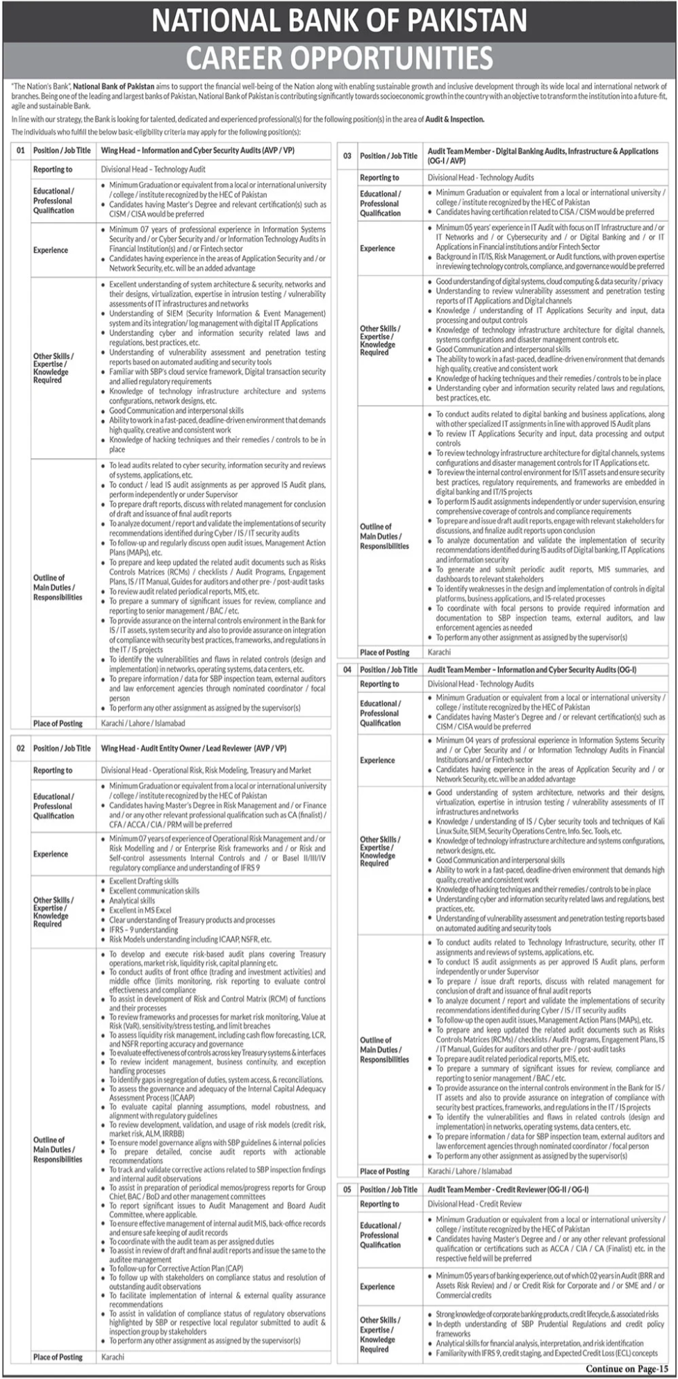 National Bank of Pakistan NBP Karachi Jobs 2026 announce the Contract career opportunities for the post of See Below Ad in Sindh, Karachi for the fresh and experienced candidates on Contract basis who have Check Advertisement degree. Posted date of this post is 19/04/2026 and the last date is 01/05/2026. if you are eligible for this job apply before due date.