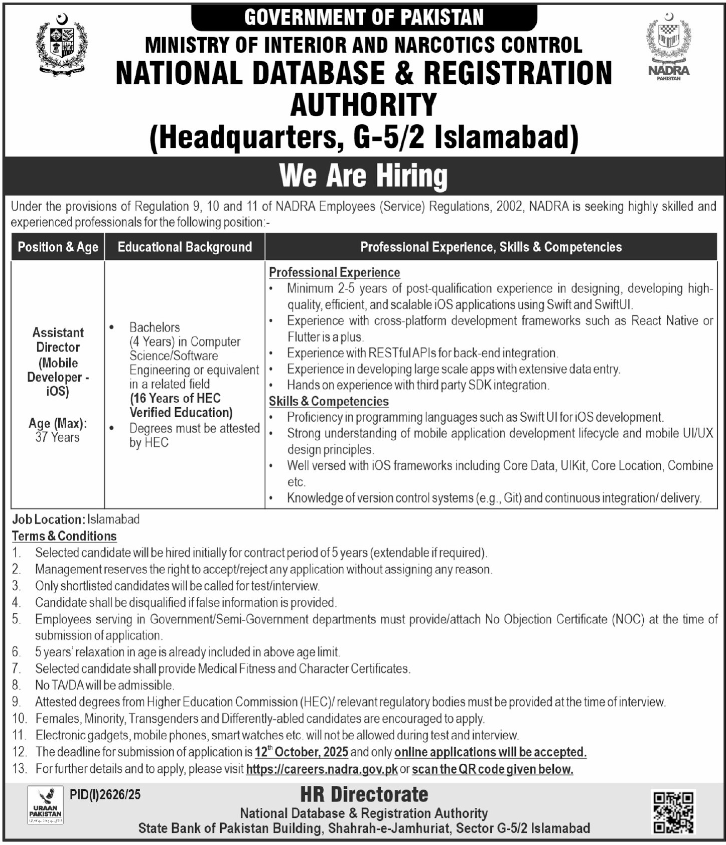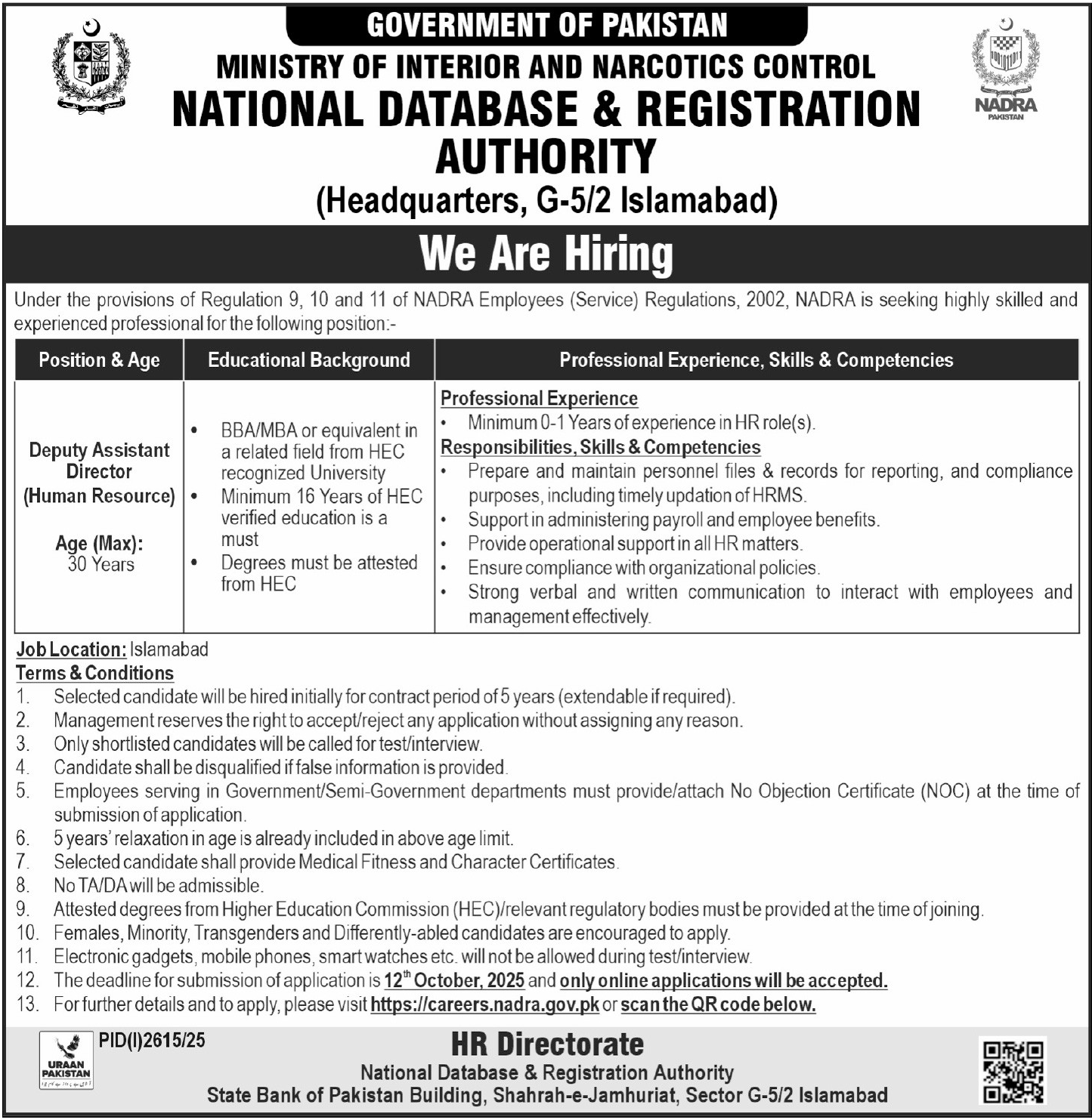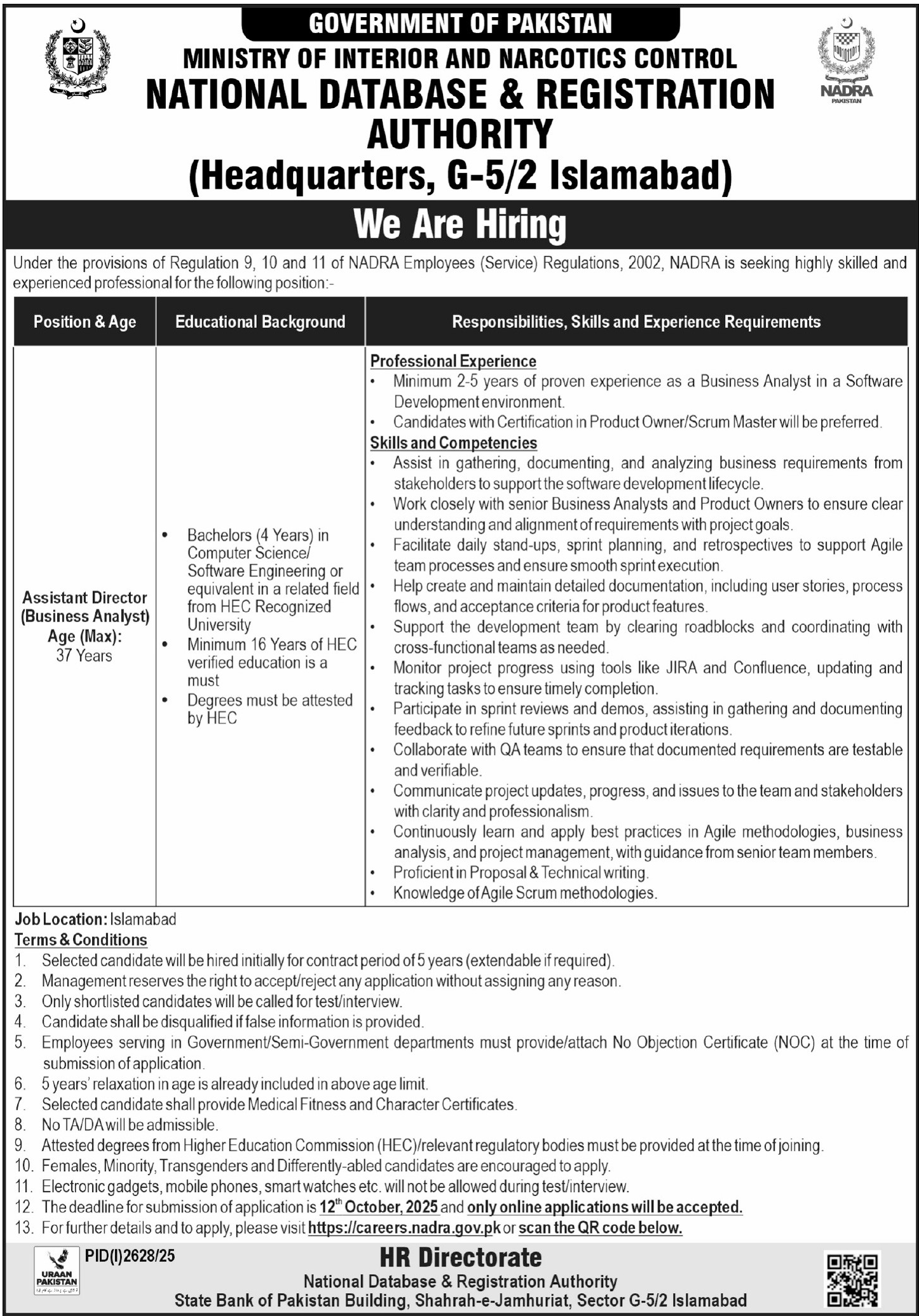 National Database & Registration Authority NADRA Job announce the Contract career opportunities for the post of See Below Ad in Federal, Islamabad for the fresh and experienced candidates on Contract basis who have Check Advertisement degree. Posted date of this post is 28/09/2025 and the last date is 12/10/2025. if you are eligible for this job apply before due date.