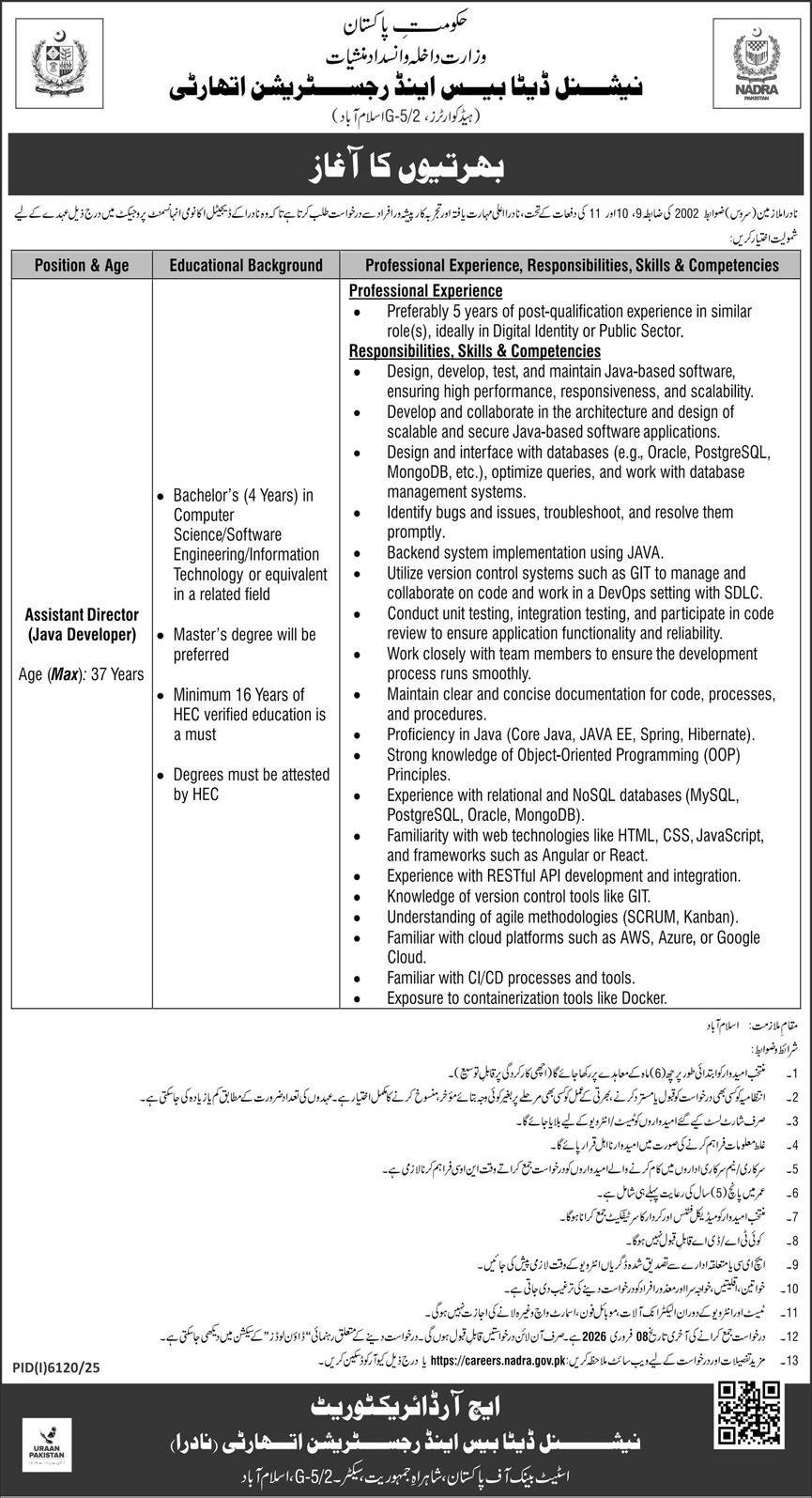 National Database & Registration Authority NADRA Jobs 2026 announce the Contract career opportunities for the post of See Below Ad in Federal, Islamabad for the fresh and experienced candidates on Contract basis who have Check Advertisement degree. Posted date of this post is 25/01/2026 and the last date is 08/02/2026. if you are eligible for this job apply before due date.