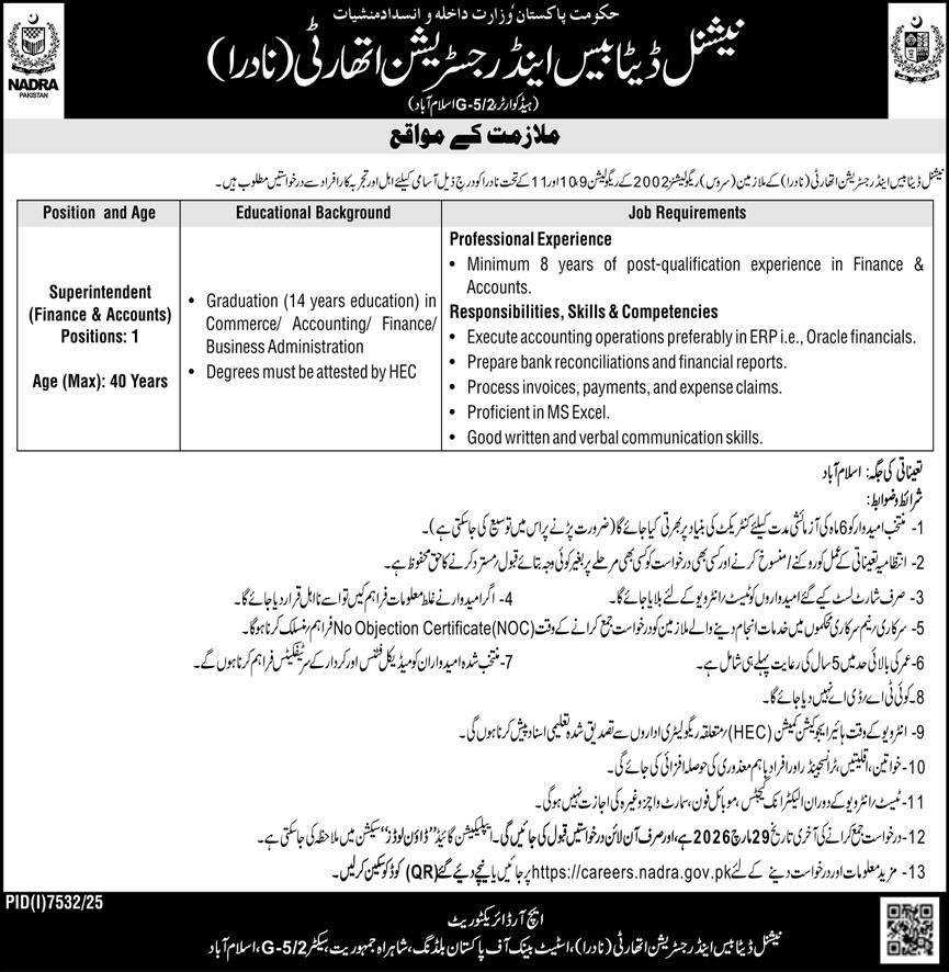 National Database & Registration Authority NADRA Jobs 2026 announce the Contract career opportunities for the post of See Below Ad in Federal, Islamabad for the fresh and experienced candidates on Contract basis who have Check Advertisement degree. Posted date of this post is 15/03/2026 and the last date is 29/03/2026. if you are eligible for this job apply before due date.
