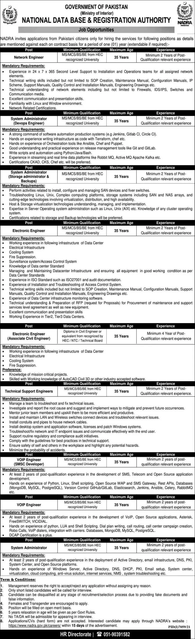 National Database & Registration Authority NADRA Jobs announce the Contract career opportunities for the post of See Below Ad in Federal,Islamabad for the fresh and experienced candidates on Contract basis who have Check Advertisement degree. Posted date of this post is 10/04/2022 and the last date is 25/04/2022. if you are eligible for this job apply before due date.