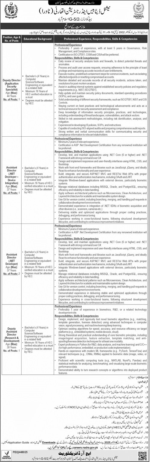 National DateBase and Registration Authority Jobs 2025 announce the Contract career opportunities for the post of See Below Ad in Federal, Islamabad for the fresh and experienced candidates on Contract basis who have Check Advertisement degree. Posted date of this post is 30/11/2025 and the last date is 14/12/2025. if you are eligible for this job apply before due date.