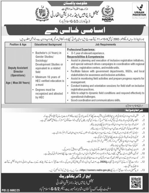 National Datebase And Registration Authority Nadra Jobs 2026 announce the Contract career opportunities for the post of See Below Ad in Federal, Islamabad for the fresh and experienced candidates on Contract basis who have Check Advertisement degree. Posted date of this post is 15/02/2026 and the last date is 01/03/2026. if you are eligible for this job apply before due date.