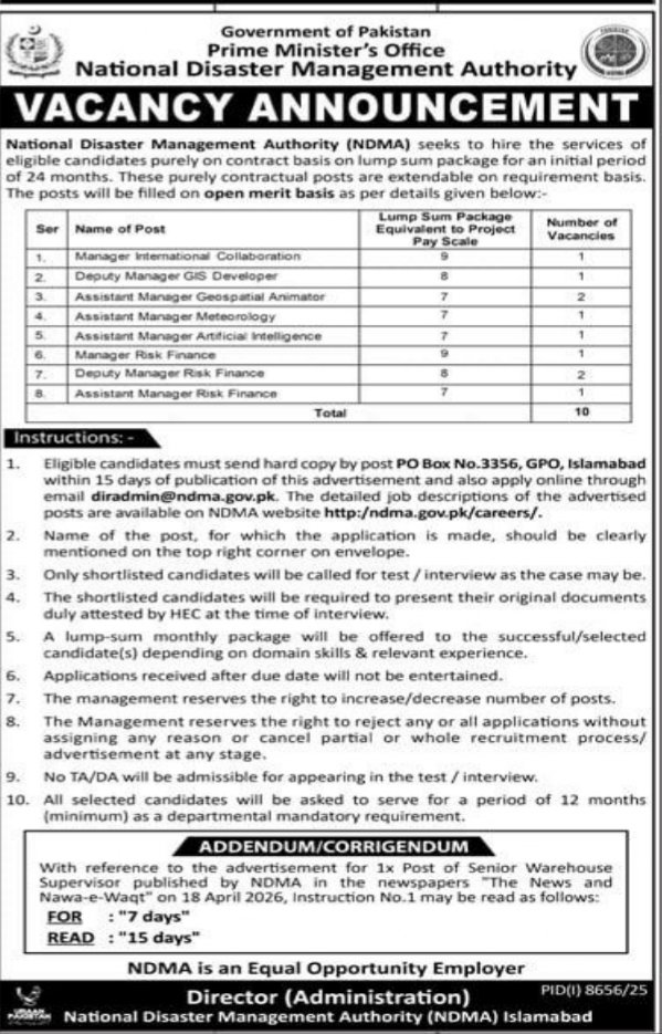 National disaster Management authority Islamabad Jobs 2026 announce the Contract career opportunities for the post of See Below Ad in Federal, Islamabad for the fresh and experienced candidates on Contract basis who have Check Advertisement degree. Posted date of this post is 26/04/2026 and the last date is 11/05/2026. if you are eligible for this job apply before due date.