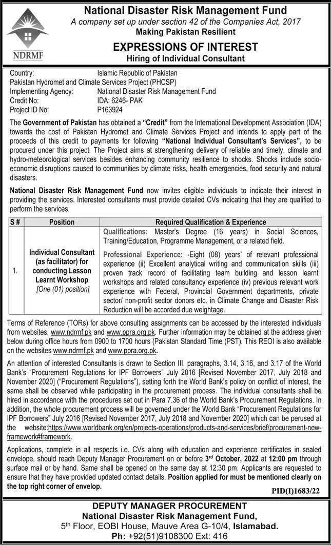 National Disaster & Risk Management Jobs 2022 announce the Contract career opportunities for the post of See Below Ad in Federal, Islamabad for the fresh and experienced candidates on Contract basis who have Check Advertisement degree. Posted date of this post is 17/09/2022 and the last date is 03/10/2022. if you are eligible for this job apply before due date.