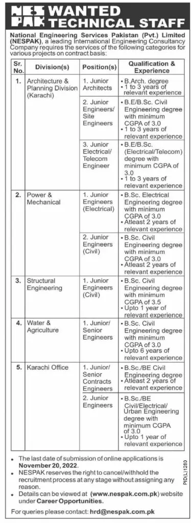 - National Engineering Services Pakistan NESPAK Karachi, karachi Sindh Pakistan invites applications from eligible candidates for the post of architect, site engineer, civil engineer, contract engineer, engineer and electrical engineer as per advertisement of November 08, 2022 published in daily Dawn Newspaper.