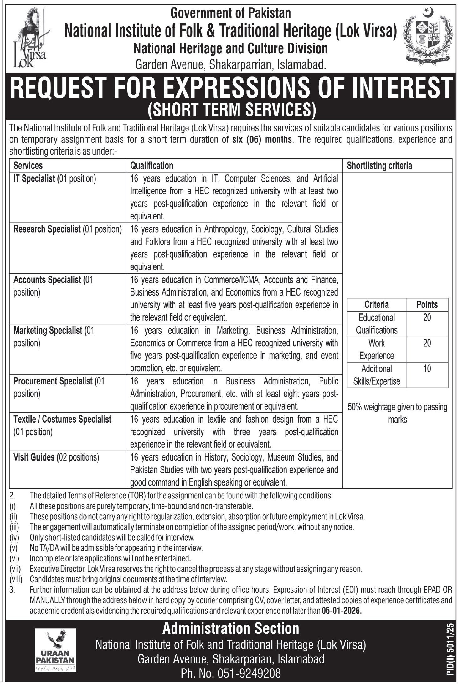 The National Institute of Folk and Traditional Heritage (Lok Virsa) requires the services of suitable candidates for various positions on temporary assignment basis for a short term duration of six (06) months. The required qualifications, experience and shortlisting criteria is as under:-