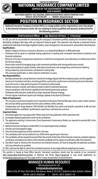 National Insurance Company Limited NICL Jobs 2026 announce the Contract career opportunities for the post of See Below Ad in Sindh, Karachi for the fresh and experienced candidates on Contract basis who have Check Advertisement degree. Posted date of this post is 08/02/2026 and the last date is 01/03/2026. if you are eligible for this job apply before due date.