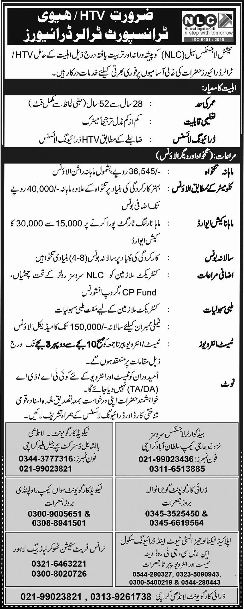 - National Logistics Cell NLC jobs advertisement dated about 18 December 2022 in daily Express Newspaper invites application for the vacant post of driver htv and arm roll driver in Rawalpindi, karachi, gujranwala and lahore Punjab Pakistan.