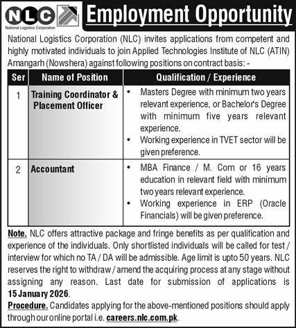 National Logistics Cell NLC Nowshera Jobs 2026 announce the Contract career opportunities for the post of See Below Ad in Khyber Pakhtunkhwa, Nowshera for the fresh and experienced candidates on Contract basis who have Check Advertisement degree. Posted date of this post is 31/12/2025 and the last date is 15/01/2026. if you are eligible for this job apply before due date.