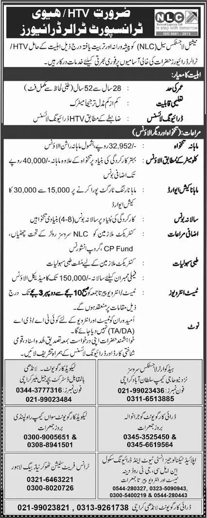 - National Logistics Cell NLC is looking for candidates for following posts as per job advertisement published in daily Mashriq Newspaper of December 11, 2022 for location Rawalpindi, gujranwala, lahore, karachi and rawalpindi Punjab Pakistan: