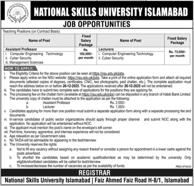 National Skills University Islamabad Job 2025 announce the Contract career opportunities for the post of See Below Ad in Federal, Islamabad for the fresh and experienced candidates on Contract basis who have Check Advertisement degree. Posted date of this post is 09/12/2025 and the last date is 23/12/2025. if you are eligible for this job apply before due date.