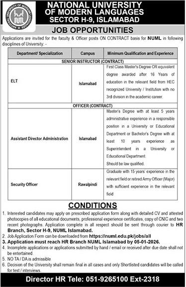 National University of Modern Languages NUML Islamabad Jobs announce the Contract career opportunities for the post of See Below Ad in Federal, Islamabad for the fresh and experienced candidates on Contract basis who have Check Advertisement degree. Posted date of this post is 21/12/2025 and the last date is 05/01/2026. if you are eligible for this job apply before due date.