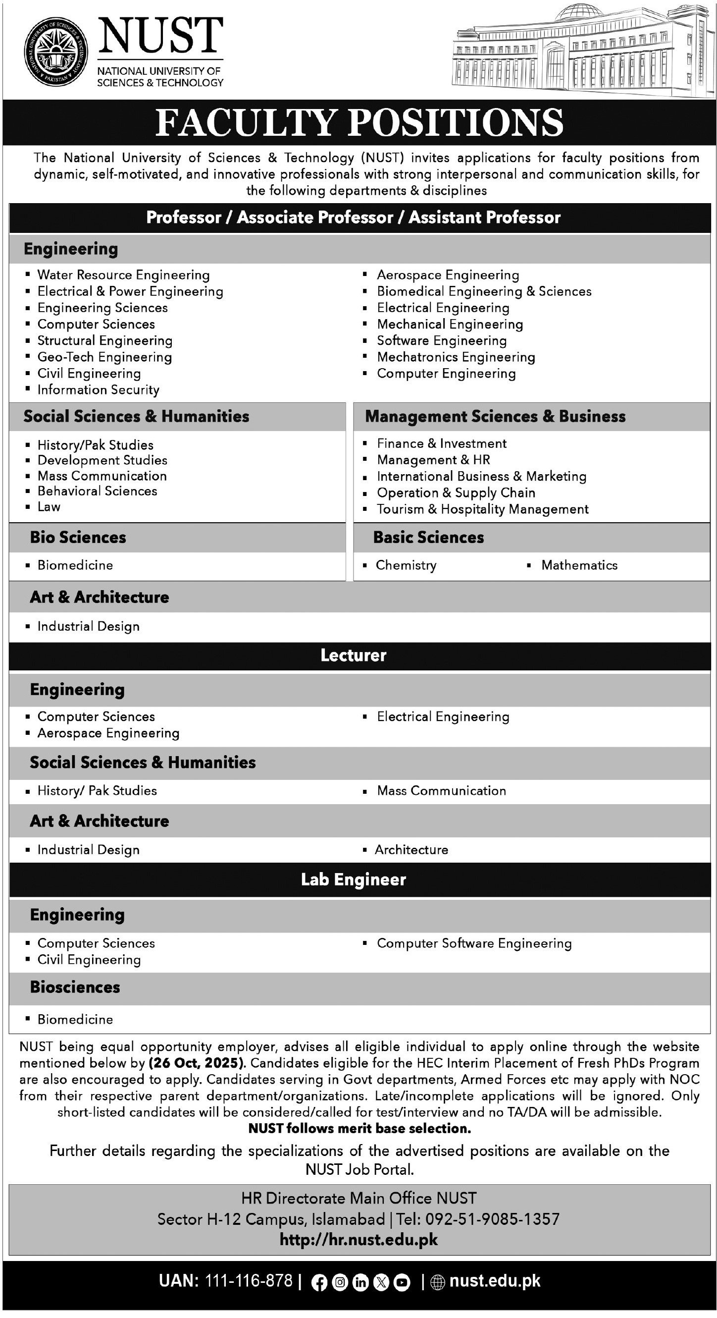 National University of Sciences & Technology NUST Jobs 2025 announce the Contract career opportunities for the post of See Below Ad in Federal, Islamabad for the fresh and experienced candidates on Contract basis who have Check Advertisement degree. Posted date of this post is 19/10/2025 and the last date is 26/10/2025. if you are eligible for this job apply before due date.