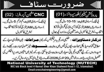 National University Of Technology NUTECH Islamabad Jobs 2026 announce the Contract career opportunities for the post of See Below Ad in Federal, Islamabad for the fresh and experienced candidates on Contract basis who have Check Advertisement degree. Posted date of this post is 01/01/2026 and the last date is 20/01/2026. if you are eligible for this job apply before due date.