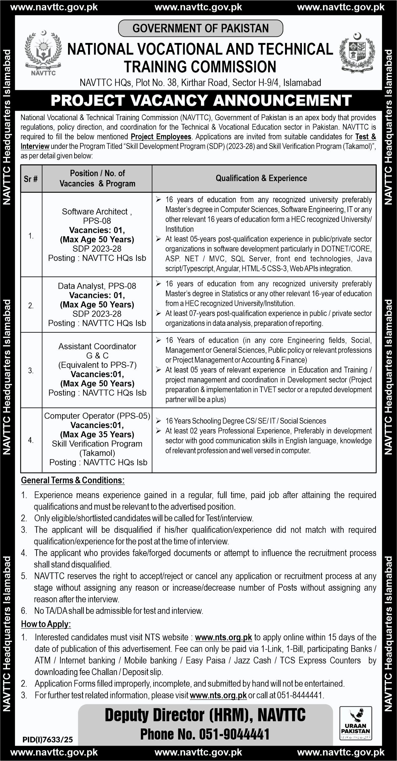 National Vocational & Technical Training Commission (NAVTTC), Government of Pakistan is an apex body that provides regulations, policy direction, and coordination for the Technical & Vocational Education sector in Pakistan. NAVTTC is required to fill the below mentioned Project Employees. Applications are invited from suitable candidates for Test & Interview under the Program Titled "Skill Development Program (SDP) (2023-28) and Skill Verification Program (Takamol)", as per detail given below: