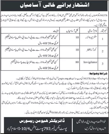 Next Generation Testing Service NGTS Islamabad Jobs 2023 announce the Contract career opportunities for the post of See Below Ad in Federal, Islamabad for the fresh and experienced candidates on Contract basis who have Check Advertisement degree. Posted date of this post is 20/06/2023 and the last date is 05/07/2023. if you are eligible for this job apply before due date.