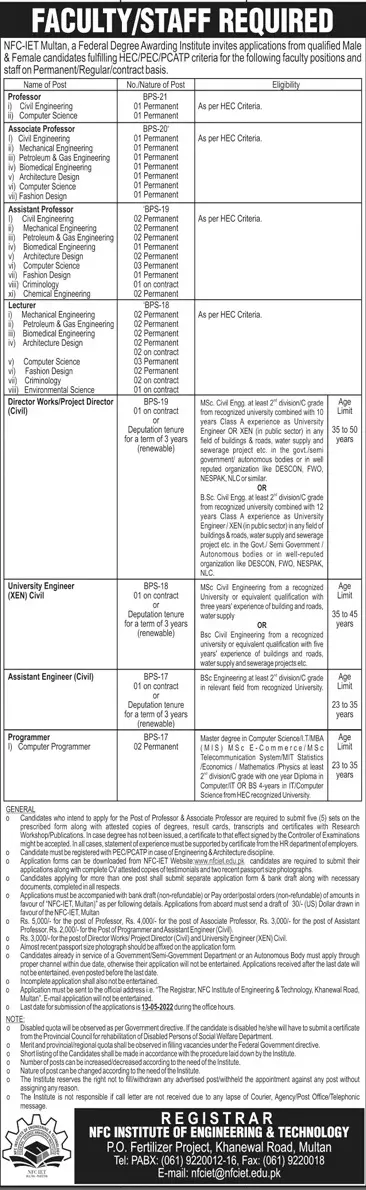 NFC Institute of Engineering & Technology Jobs announce the Contract career opportunities for the post of See Below Ad in Punjab, Multan for the fresh and experienced candidates on Contract basis who have Check Advertisement degree. Posted date of this post is 17/04/2022 and the last date is 13/05/2022. if you are eligible for this job apply before due date.