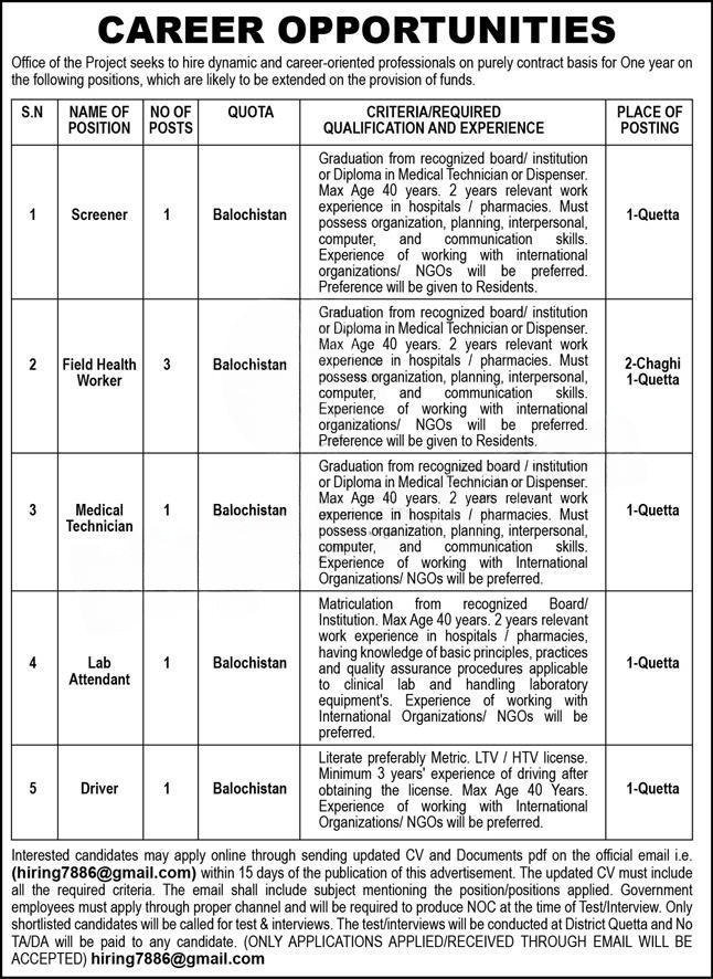 NGO Quetta Balochistan Jobs 2026 announce the Contract career opportunities for the post of See Below Ad in Balochistan, Quetta for the fresh and experienced candidates on Contract basis who have Check Advertisement degree. Posted date of this post is 24/04/2026 and the last date is 08/05/2026. if you are eligible for this job apply before due date.