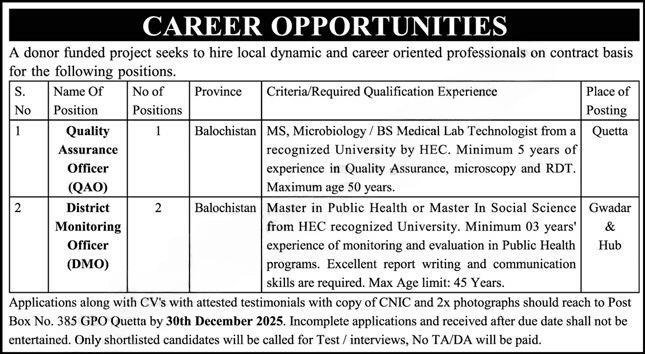 NGO Quetta Gwadar Hub Jobs 2025 announce the Contract career opportunities for the post of See Below Ad in Balochistan, Gwadar for the fresh and experienced candidates on Contract basis who have Check Advertisement degree. Posted date of this post is 07/12/2025 and the last date is 30/12/2025. if you are eligible for this job apply before due date.