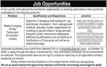 Interested candidates may submit their detailed CVs at hrdeptqta@gmail.com by October 15, 2025, or apply through the above-mentioned link. Only shortlisted candidates will be contacted for an interview. The organization reserves the right to accept or reject any or all applications without assigning any reason.