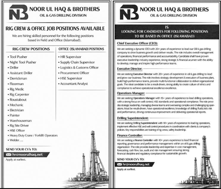 Noor Ul Haq & Brothers Islamabad Jobs 2025 announce the Contract career opportunities for the post of See Below Ad in Federal, Islamabad for the fresh and experienced candidates on Contract basis who have Check Advertisement degree. Posted date of this post is 30/12/2025 and the last date is 10/01/2026. if you are eligible for this job apply before due date.