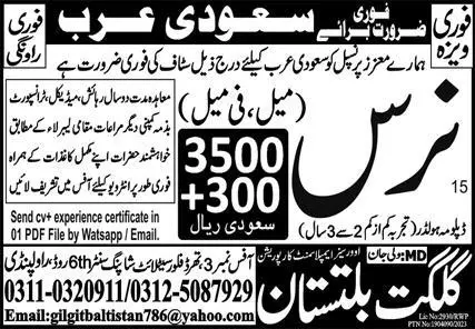 Nurse & Male Nurse Jobs 2023 In Saudi Arabia announce the Contract career opportunities for the post of See Below Ad in Saudi Arabia for the fresh and experienced candidates on Contract basis who have Check Advertisement degree. Posted date of this post is 12/09/2023 and the last date is 19/09/2023. if you are eligible for this job apply before due date.