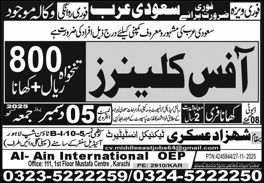 Office Cleaner Jobs Open In Saudi Arabia 2025 announce the Contract career opportunities for the post of See Below Ad in Saudi Arabia for the fresh and experienced candidates on Contract basis who have Check Advertisement degree. Posted date of this post is 29/11/2025 and the last date is 05/12/2025. if you are eligible for this job apply before due date.