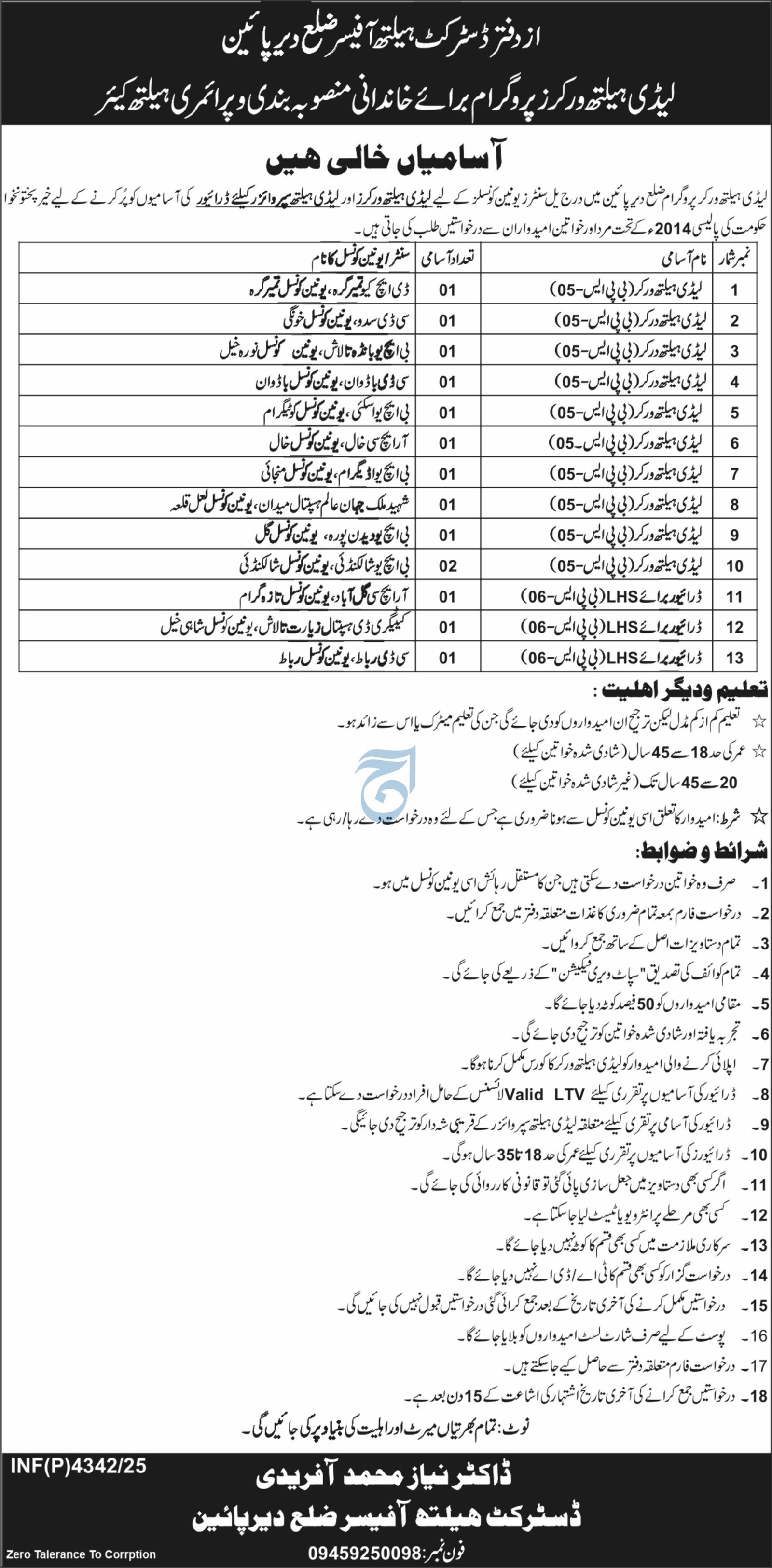 Applications are invited from male and female candidates for filling the vacant posts of Lady Health Workers, Lady Health Supervisors, and Drivers in the Lady Health Worker Program in District Lower Dir for the listed centers/union councils, as per the Khyber Pakhtunkhwa Government Policy of 2014.