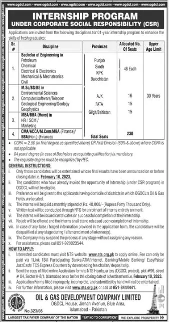 Oil and Gas Development Company Internship Program 2023 announce the Contract career opportunities for the post of See Below Ad in Federal, Islamabad for the fresh and experienced candidates on Contract basis who have Check Advertisement degree. Posted date of this post is 22/01/2023 and the last date is 10/02/2023. if you are eligible for this job apply before due date.