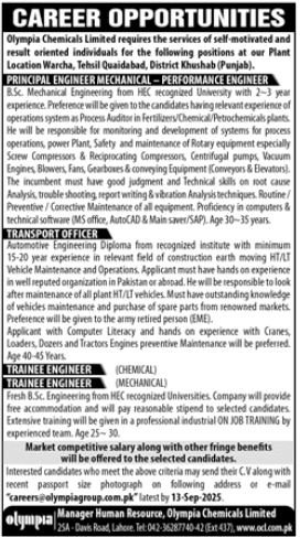 Olympia Chemicals Limited Lahore Jobs 2025 announce the Contract career opportunities for the post of See Below Ad in Punjab, Lahore for the fresh and experienced candidates on Contract basis who have Check Advertisement degree. Posted date of this post is 31/08/2025 and the last date is 13/09/2025. if you are eligible for this job apply before due date.